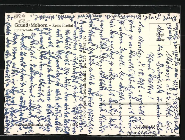 Personenbezogene Daten auf der Rückseite der Karte wurden durch blauen Textmarker unkenntlich gemacht. Die blauen Stellen sind auf die Vorderseite durchgeweicht und wirken sich negativ auf das Postkartenfoto aus