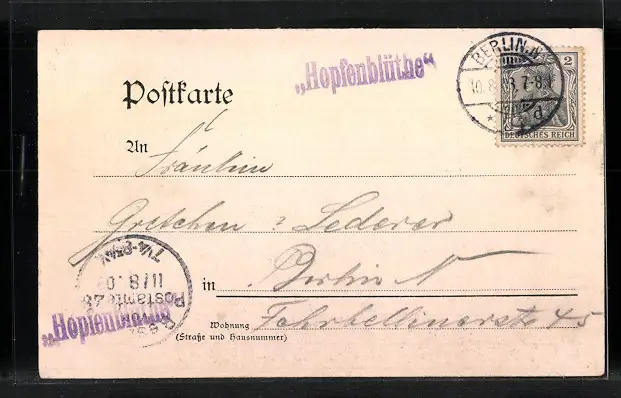 Personenbezogene Daten auf der Rückseite der Karte wurden durch blauen Textmarker unkenntlich gemacht. Die blauen Stellen sind auf die Vorderseite durchgeweicht und wirken sich negativ auf das Postkartenfoto aus