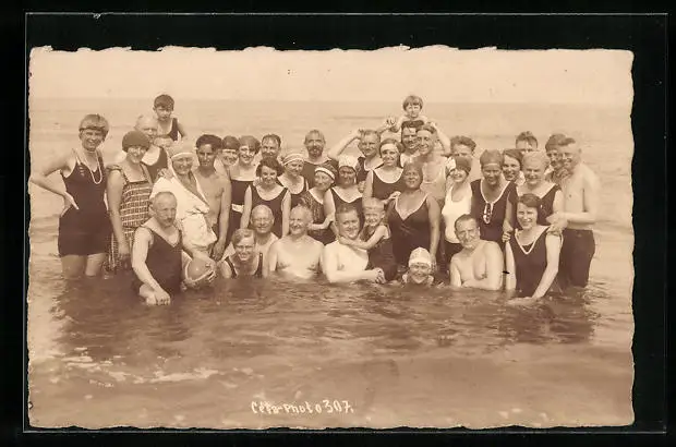 AK Gruppenbild im Meer, vom Kleinkind bis zum Grossvater in Bademode
