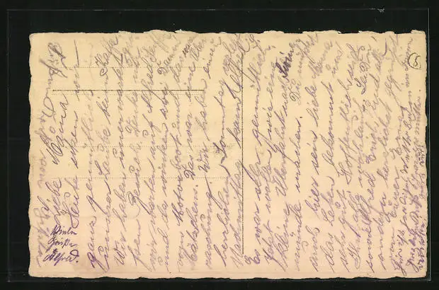 Personenbezogene Daten auf der Rückseite der Karte wurden durch blauen Textmarker unkenntlich gemacht. Die blauen Stellen sind auf die Vorderseite durchgeweicht und wirken sich negativ auf das Postkartenfoto aus