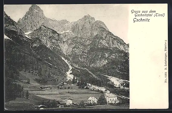 AK Gschnitz, Ortsansicht mit Gebirgspanorama