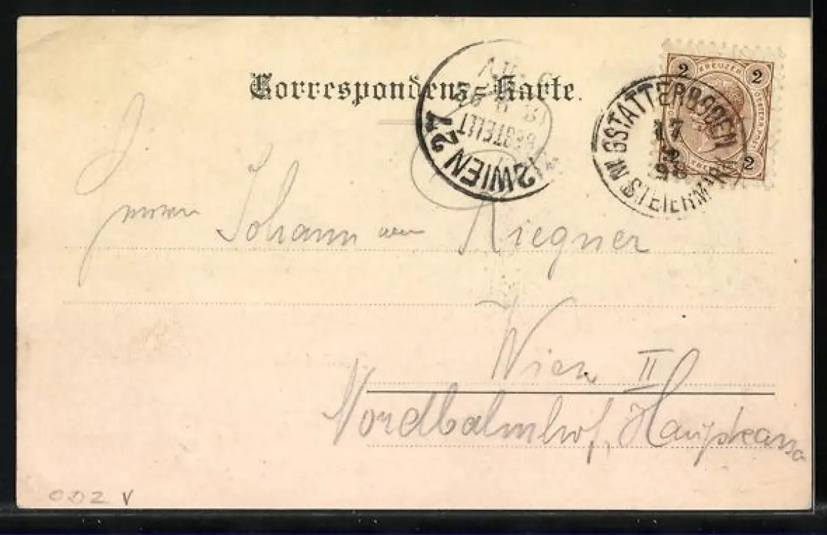 Personenbezogene Daten auf der Rückseite der Karte wurden durch blauen Textmarker unkenntlich gemacht. Die blauen Stellen sind auf die Vorderseite durchgeweicht und wirken sich negativ auf das Postkartenfoto aus