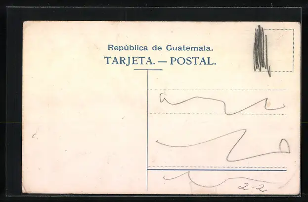Personenbezogene Daten auf der Rückseite der Karte wurden durch blauen Textmarker unkenntlich gemacht. Die blauen Stellen sind auf die Vorderseite durchgeweicht und wirken sich negativ auf das Postkartenfoto aus