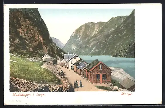 AK Gudvangen, Blick auf Häuser am Fjord mit Bergen
