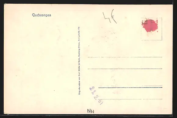 Personenbezogene Daten auf der Rückseite der Karte wurden durch blauen Textmarker unkenntlich gemacht. Die blauen Stellen sind auf die Vorderseite durchgeweicht und wirken sich negativ auf das Postkartenfoto aus