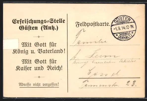 alte Ansichtskarte, gelaufen 1914, vorderseitig Klebe- und Papierreste, guter Zustand