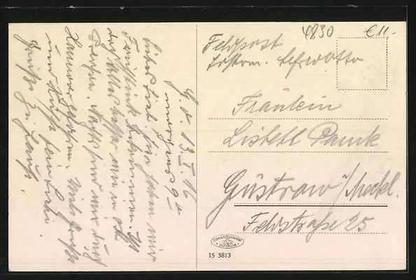 Personenbezogene Daten auf der Rückseite der Karte wurden durch blauen Textmarker unkenntlich gemacht. Die blauen Stellen sind auf die Vorderseite durchgeweicht und wirken sich negativ auf das Postkartenfoto aus