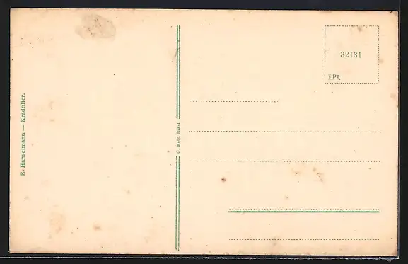 Personenbezogene Daten auf der Rückseite der Karte wurden durch blauen Textmarker unkenntlich gemacht. Die blauen Stellen sind auf die Vorderseite durchgeweicht und wirken sich negativ auf das Postkartenfoto aus