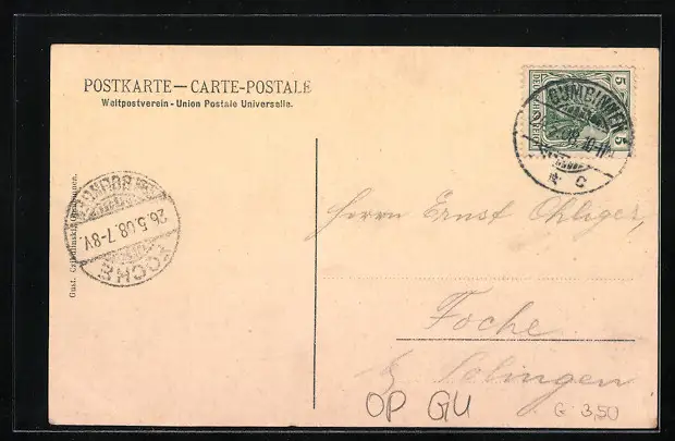 gelaufen 1908, Eckknicke li. oben und re. unten, guter Zustand