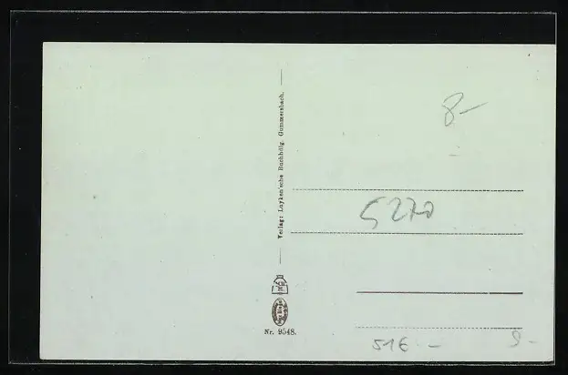 Personenbezogene Daten auf der Rückseite der Karte wurden durch blauen Textmarker unkenntlich gemacht. Die blauen Stellen sind auf die Vorderseite durchgeweicht und wirken sich negativ auf das Postkartenfoto aus