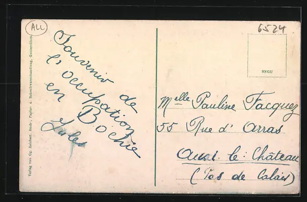 Personenbezogene Daten auf der Rückseite der Karte wurden durch blauen Textmarker unkenntlich gemacht. Die blauen Stellen sind auf die Vorderseite durchgeweicht und wirken sich negativ auf das Postkartenfoto aus