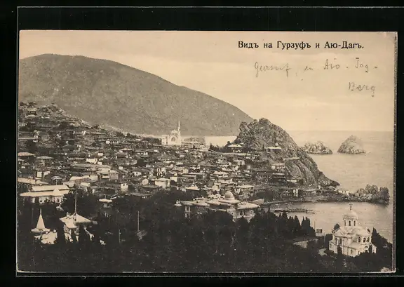 AK Gursuf /Krim, Totalansicht, Kirche, Meer