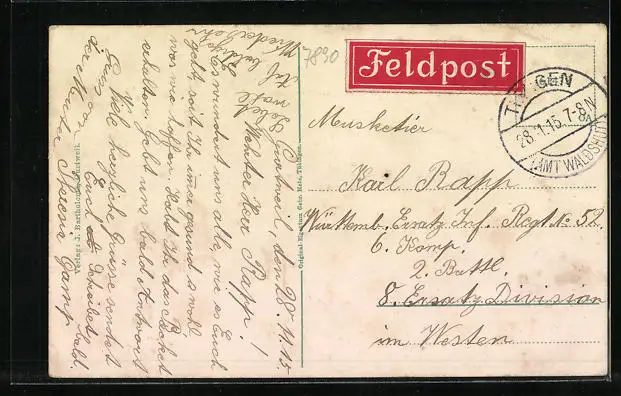 alte Ansichtskarte, gelaufen 1915, rückseitig Klebe- und Papierreste, Eckknick li. oben u. re. unten, Abriebspur re. oben, guter Zustand