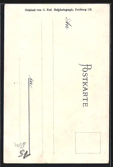 Personenbezogene Daten auf der Rückseite der Karte wurden durch blauen Textmarker unkenntlich gemacht. Die blauen Stellen sind auf die Vorderseite durchgeweicht und wirken sich negativ auf das Postkartenfoto aus