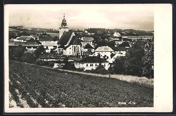 AK Gutau, Totalansicht mit Kirche von einem Acker aus