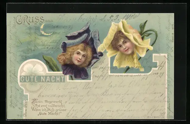 AK Gute Nacht, Frauenköpfe in Blüten