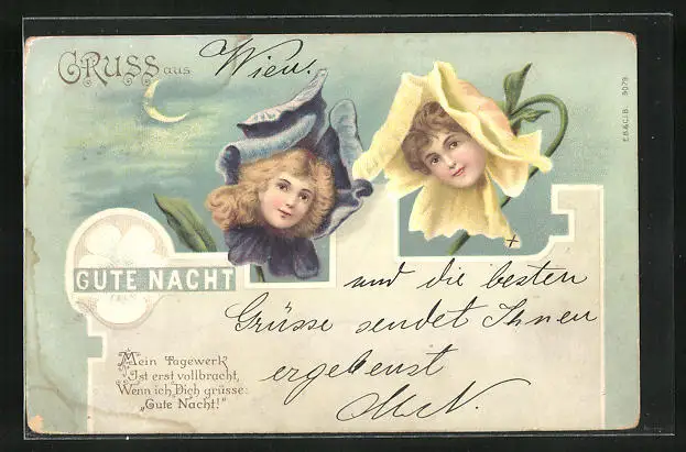AK Gute Nacht, zwei Blüten mit Mädchengesichtern, Metamorphose