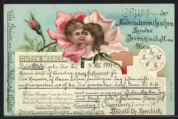 AK Guten Morgen, Kinderköpfe in Blüten, Metamorphose