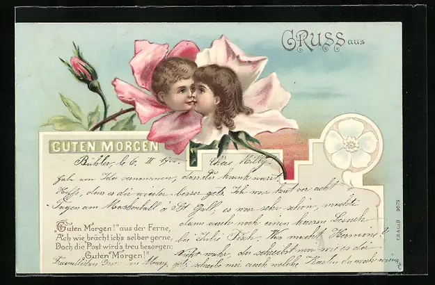 AK Guten Morgen, Kinderpaar in Blumen, Metamorphose
