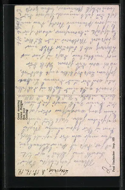 Personenbezogene Daten auf der Rückseite der Karte wurden durch blauen Textmarker unkenntlich gemacht. Die blauen Stellen sind auf die Vorderseite durchgeweicht und wirken sich negativ auf das Postkartenfoto aus