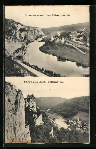 AK Gutenstein, Totalansicht mit Felsentunnels, Partie mit Ruine Falkenstein