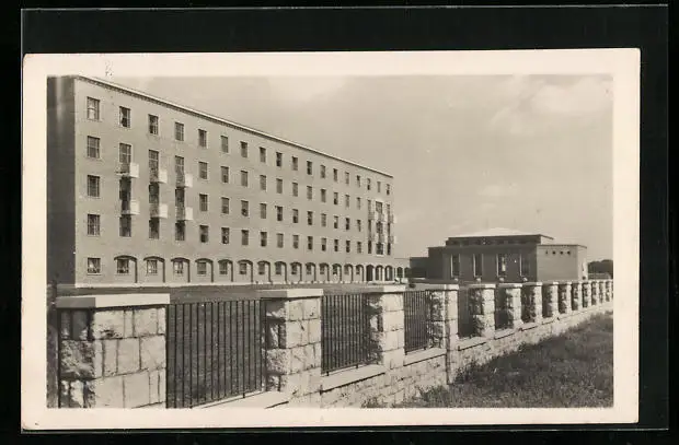 AK Györ, Langes Flachgebäude und Nebanbau hinter einer Mauer