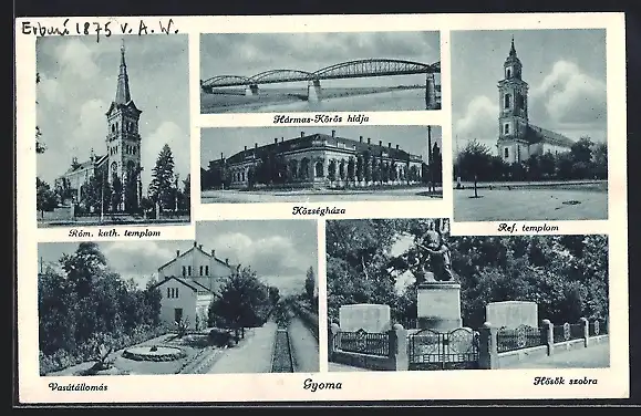 AK Gyoma, Vasutallomas, Harmas-Körös-hidja, Ref. templom, Bahnhof