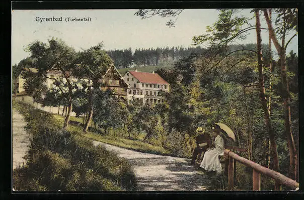 AK Gyrenbad bei Turbental, Ortsansicht hinter Paar auf einer Bank