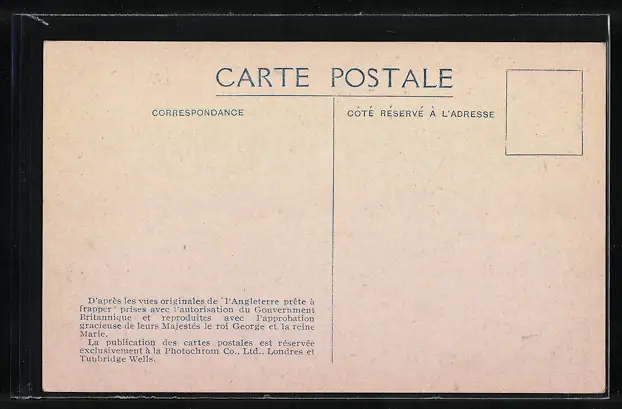 Personenbezogene Daten auf der Rückseite der Karte wurden durch blauen Textmarker unkenntlich gemacht. Die blauen Stellen sind auf die Vorderseite durchgeweicht und wirken sich negativ auf das Postkartenfoto aus