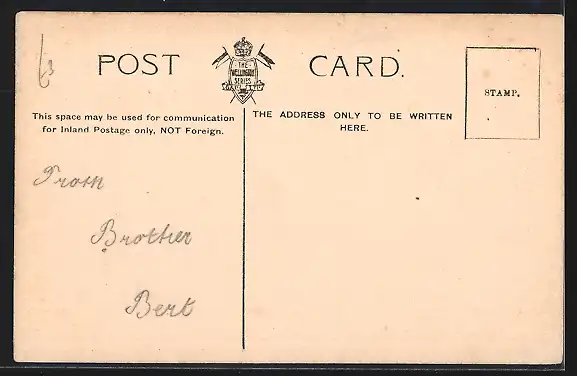 Personenbezogene Daten auf der Rückseite der Karte wurden durch blauen Textmarker unkenntlich gemacht. Die blauen Stellen sind auf die Vorderseite durchgeweicht und wirken sich negativ auf das Postkartenfoto aus