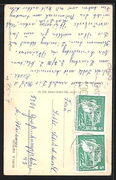 Personenbezogene Daten auf der Rückseite der Karte wurden durch blauen Textmarker unkenntlich gemacht. Die blauen Stellen sind auf die Vorderseite durchgeweicht und wirken sich negativ auf das Postkartenfoto aus