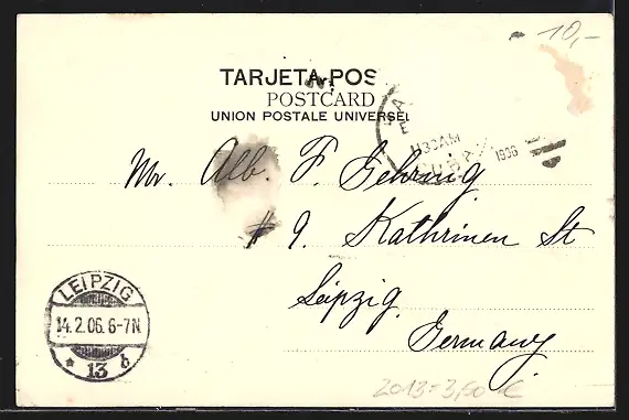 gelaufen 1906, Briefmarke entfernt, rückseitig Oberflächenschaden, Eckknick re. unten, guter Zustand