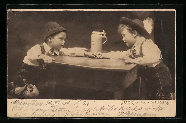 AK Hackl`n ma a Wengerl!, zwei Buben in Lederhosen beim Fingerhackl`n