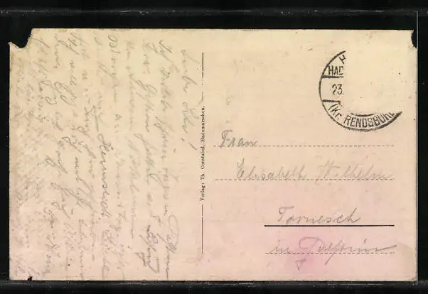 alte Ansichtskarte, gelaufen, Briefmarke entfernt, Eckschäden oben li. u. re., Randschaden unten re., Eckknick unten re., guter Zustand
