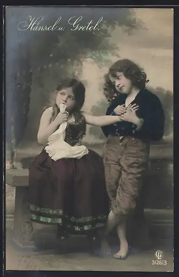 AK Hänsel und Gretel sitzen auf einer Bank im Wald