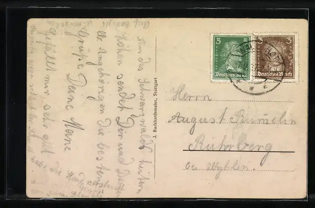 Personenbezogene Daten auf der Rückseite der Karte wurden durch blauen Textmarker unkenntlich gemacht. Die blauen Stellen sind auf die Vorderseite durchgeweicht und wirken sich negativ auf das Postkartenfoto aus