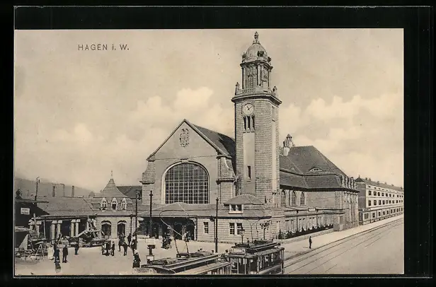 AK Hagen i. W., Der Bahnhof mit Strassenbahn