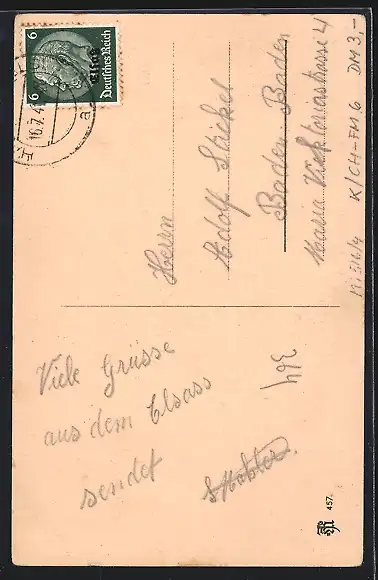 Personenbezogene Daten auf der Rückseite der Karte wurden durch blauen Textmarker unkenntlich gemacht. Die blauen Stellen sind auf die Vorderseite durchgeweicht und wirken sich negativ auf das Postkartenfoto aus