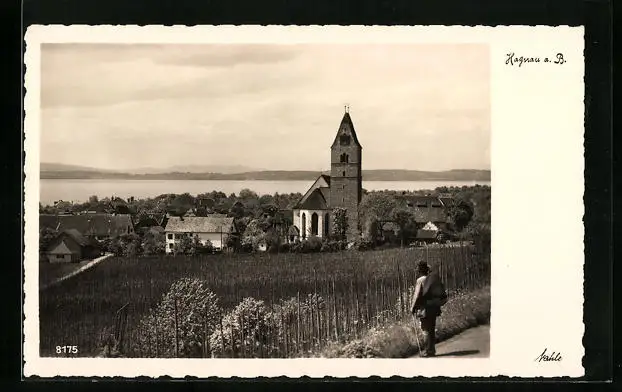 AK Hagnau a. B., Panorama des Ortes hinter Feldern