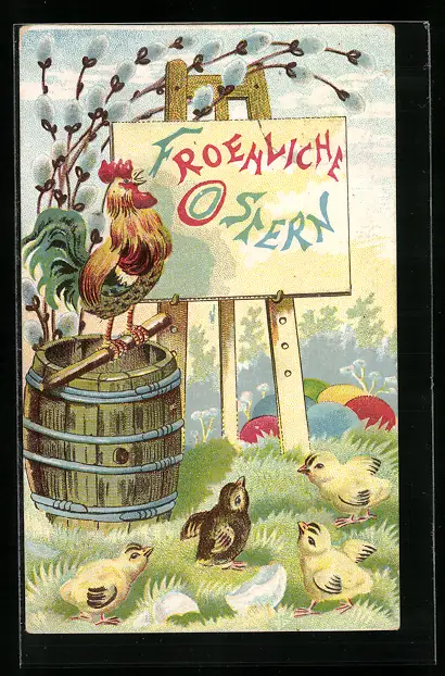 AK Hahn steht auf einer Stange und kräht mit Weidenkätzchenzweigen & Küken, Ostern