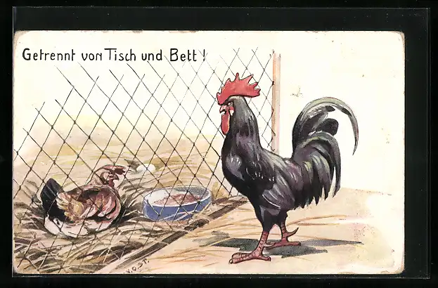 AK Hahn und Huhn, durch Maschendraht getrennt