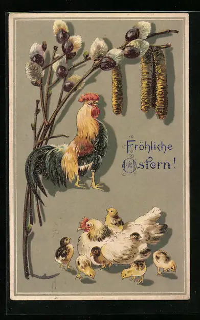 AK Hahn und Osterküken mit Palmkätzchenzweigen