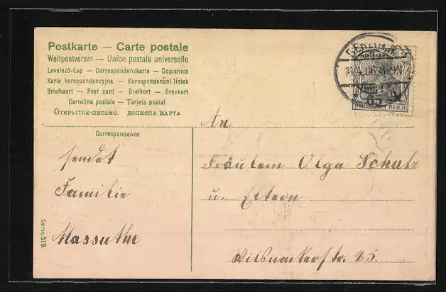 Personenbezogene Daten auf der Rückseite der Karte wurden durch blauen Textmarker unkenntlich gemacht. Die blauen Stellen sind auf die Vorderseite durchgeweicht und wirken sich negativ auf das Postkartenfoto aus