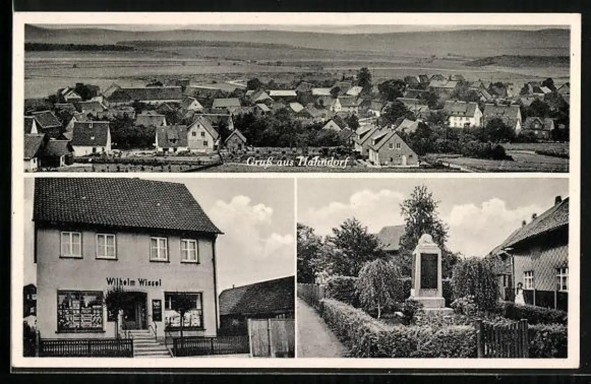 AK Hahndorf, Gemischtwaren Wilhelm Wissel, Kriegerdenkmal, Ortsansicht