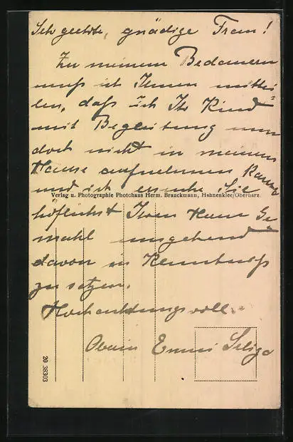Personenbezogene Daten auf der Rückseite der Karte wurden durch blauen Textmarker unkenntlich gemacht. Die blauen Stellen sind auf die Vorderseite durchgeweicht und wirken sich negativ auf das Postkartenfoto aus