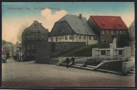 AK Hainichen i. Sa., Strassenpartie am Keller-Denkmal