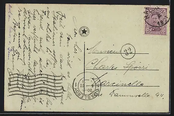 Personenbezogene Daten auf der Rückseite der Karte wurden durch blauen Textmarker unkenntlich gemacht. Die blauen Stellen sind auf die Vorderseite durchgeweicht und wirken sich negativ auf das Postkartenfoto aus