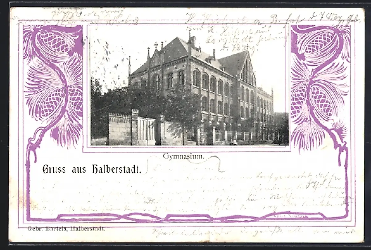 AK Halberstadt, Gymnasium im Passepartout mit Tannenzweig