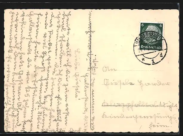 Personenbezogene Daten auf der Rückseite der Karte wurden durch blauen Textmarker unkenntlich gemacht. Die blauen Stellen sind auf die Vorderseite durchgeweicht und wirken sich negativ auf das Postkartenfoto aus