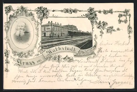 AK Halbstadt, Bahnhof mit Gleisen, Portrait Herr mit Vollbart